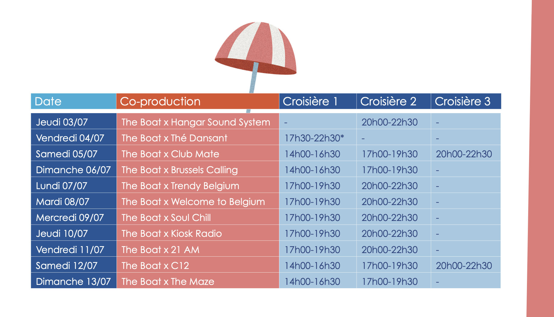 Quai d'Été forms the first part of the City of Brussels' wider summer programme, 'Plaisirs d'Été' – the counterpart of the capital's Christmas event 'Plaisirs d'Hiver'.