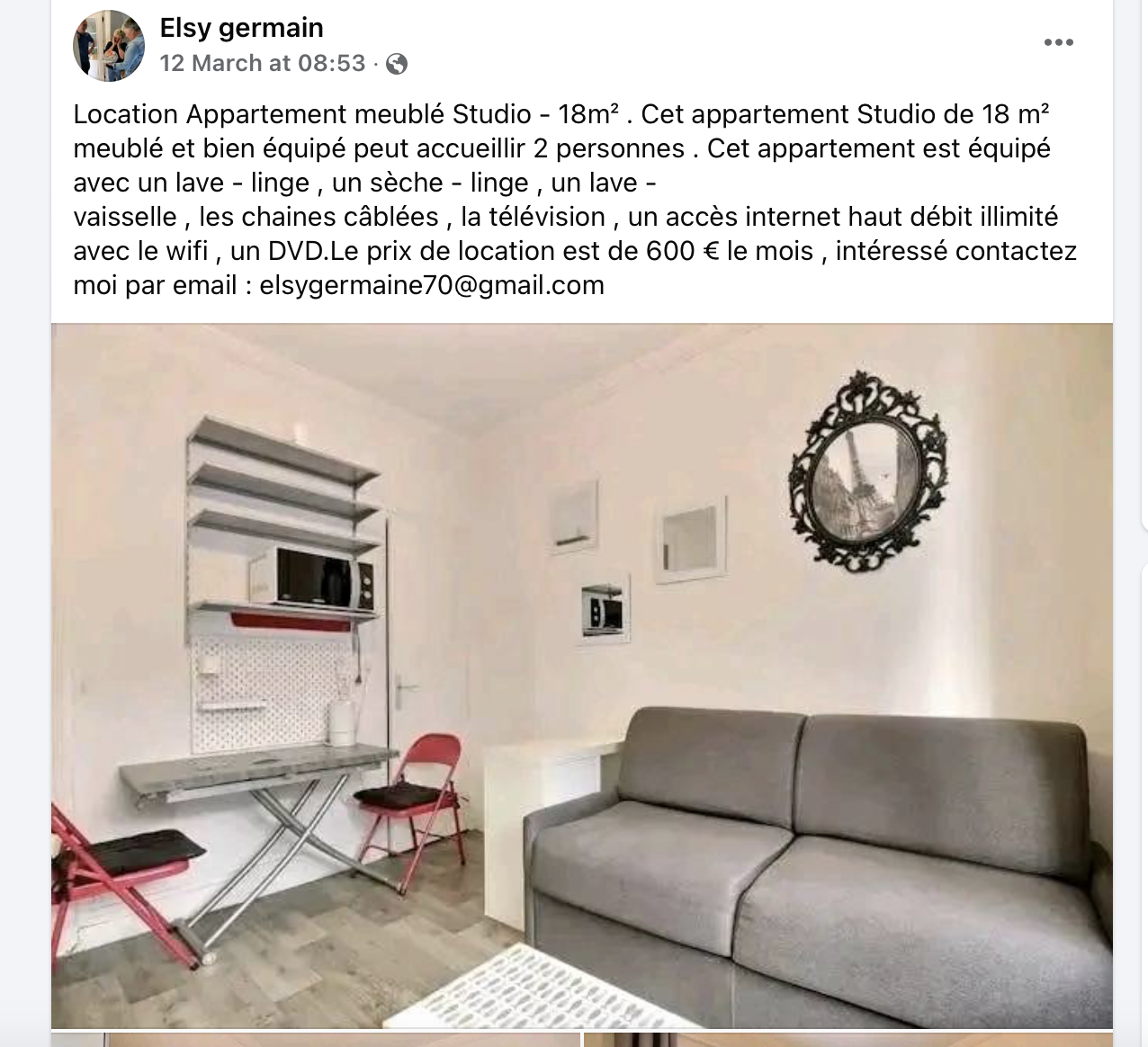 Example of a Facebook scam. Telltale signs include strange formatting, cheap rent, fake profile and email address.