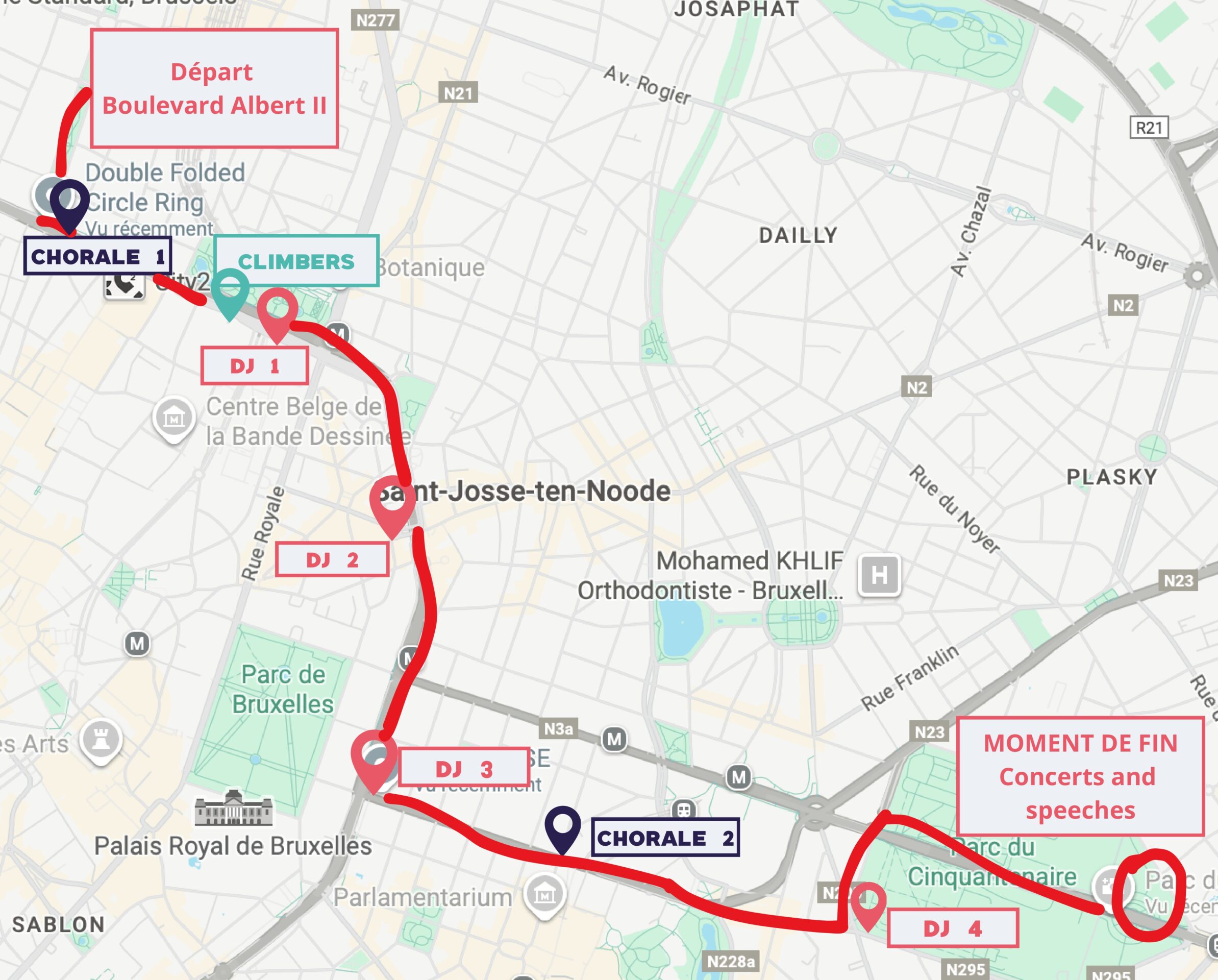 Activists will gather at noon near Brussels-North station, marching from Boulevard Roi Albert II along Boulevard du Jardin Botanique to Boulevard Bischoffsheim and Boulevard du Régent, turning at Rue Belliard and arriving at the Cinquantenaire Park.