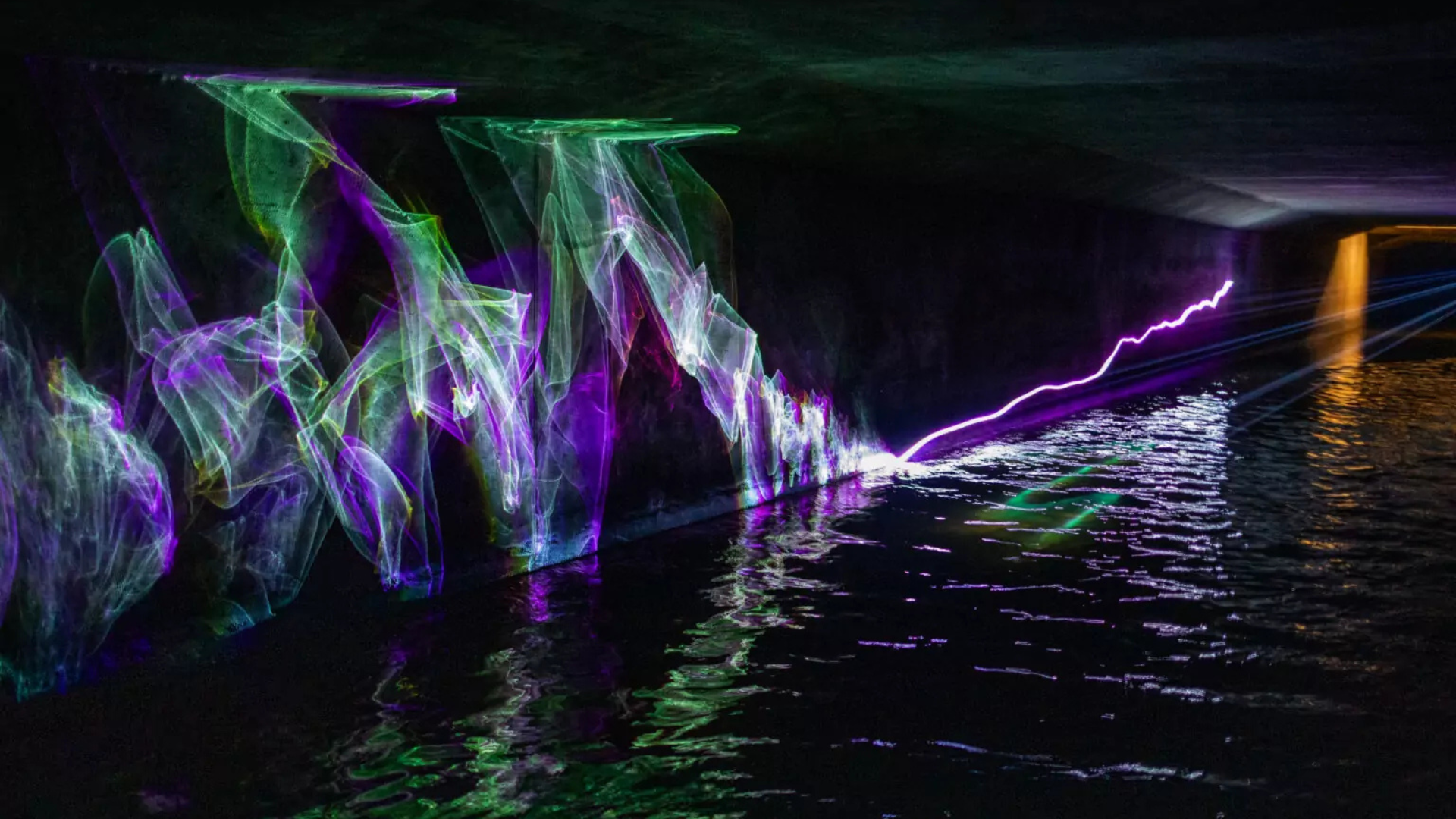 The light and sound of the installation are controlled by live environmental data of the river, offering visitors an experience that combines history, art, and science.