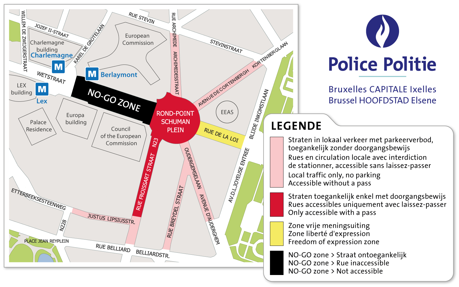 - Avenue de Cortenbergh (between Rue Stevin and the Schuman roundabout, with limited access during escorts).