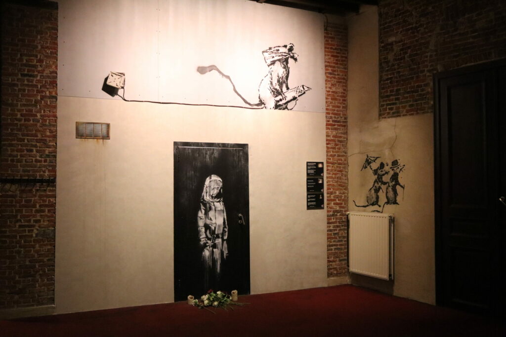 The flower thrower and other West Bank wall murals of Banksy. Recreation in Brussels Banksy museum. Credit: Kosmos Khoroshavin / The Brussels Times