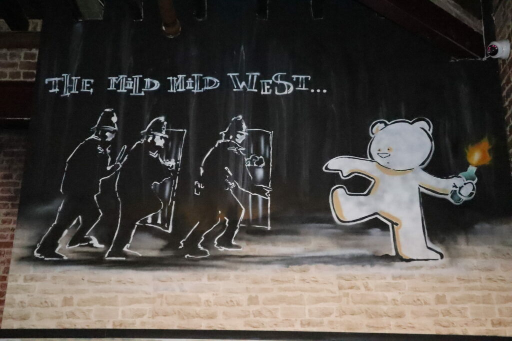 Banksy is speculated to have started his art career around the 1990s in Bristol. His first iconic mural, covering an advertisement, is the Mild Mild West. Photo of a reproduction from the Brussels Banksy museum. Credit: Kosmos Khoroshavin / The Brussels Times