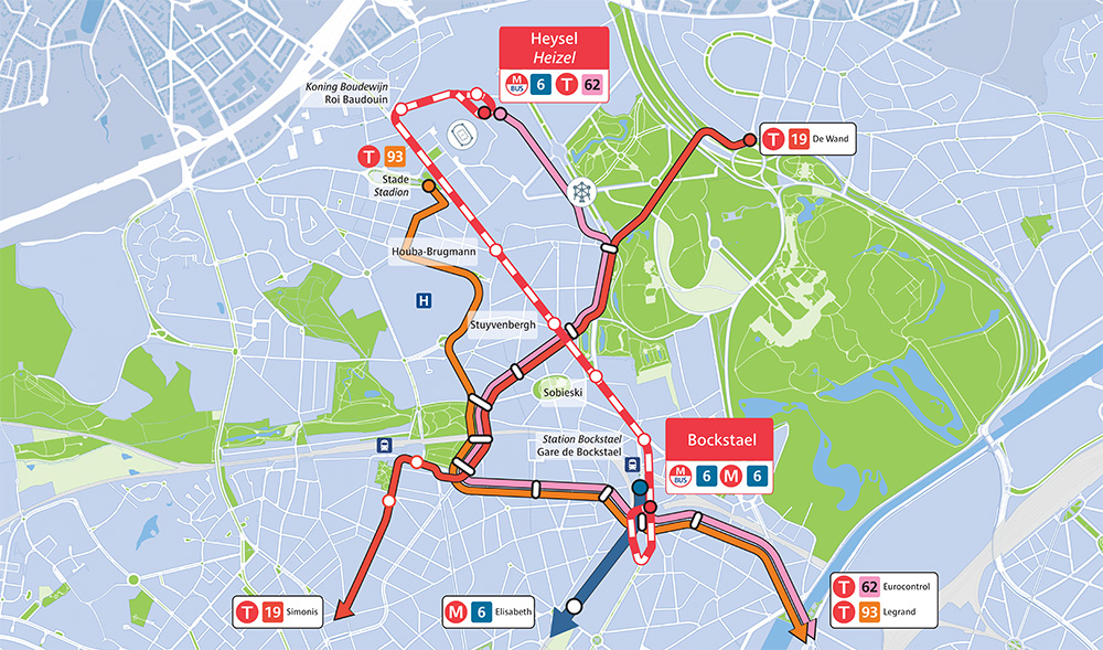 Passengers can also take tram 9 between Simonis and Koning Boudewijn/King Baudouin, tram 62 between Bockstael and Heizel/Heysel via Stuyvenbergh, tram 93 between Bockstael and Stadion and bus 83 between Koning Boudewijn/King Baudouin and Heizel/Heysel.