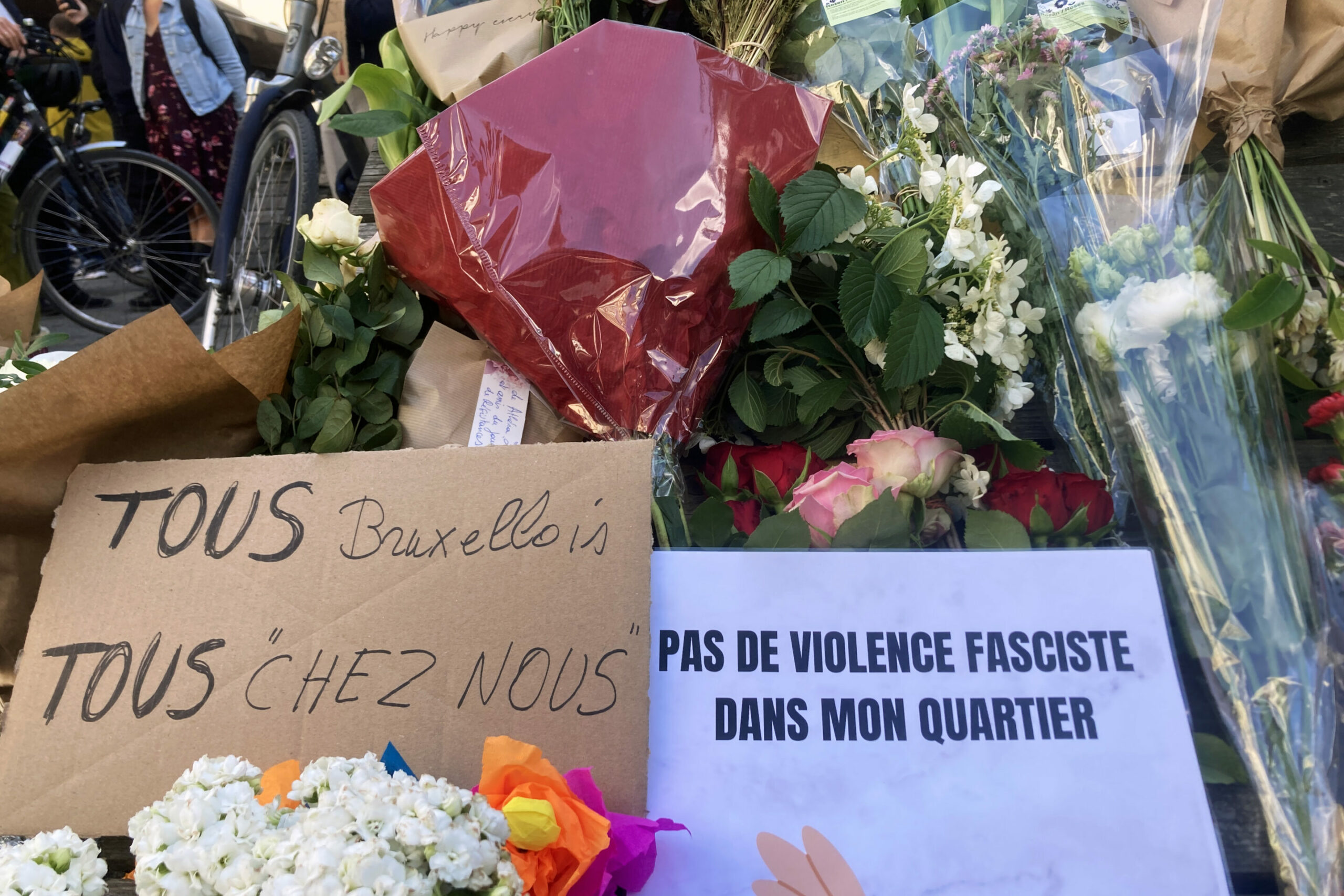 "No fascist violence in my neighbourhood" and "All Brussels residents, all at home" could be read on some signs. The rally was organised by residents, on the square at the end of Rue de Mexico. Flowers were placed on the square and on the facade of the DIY store, which was located nearby.
