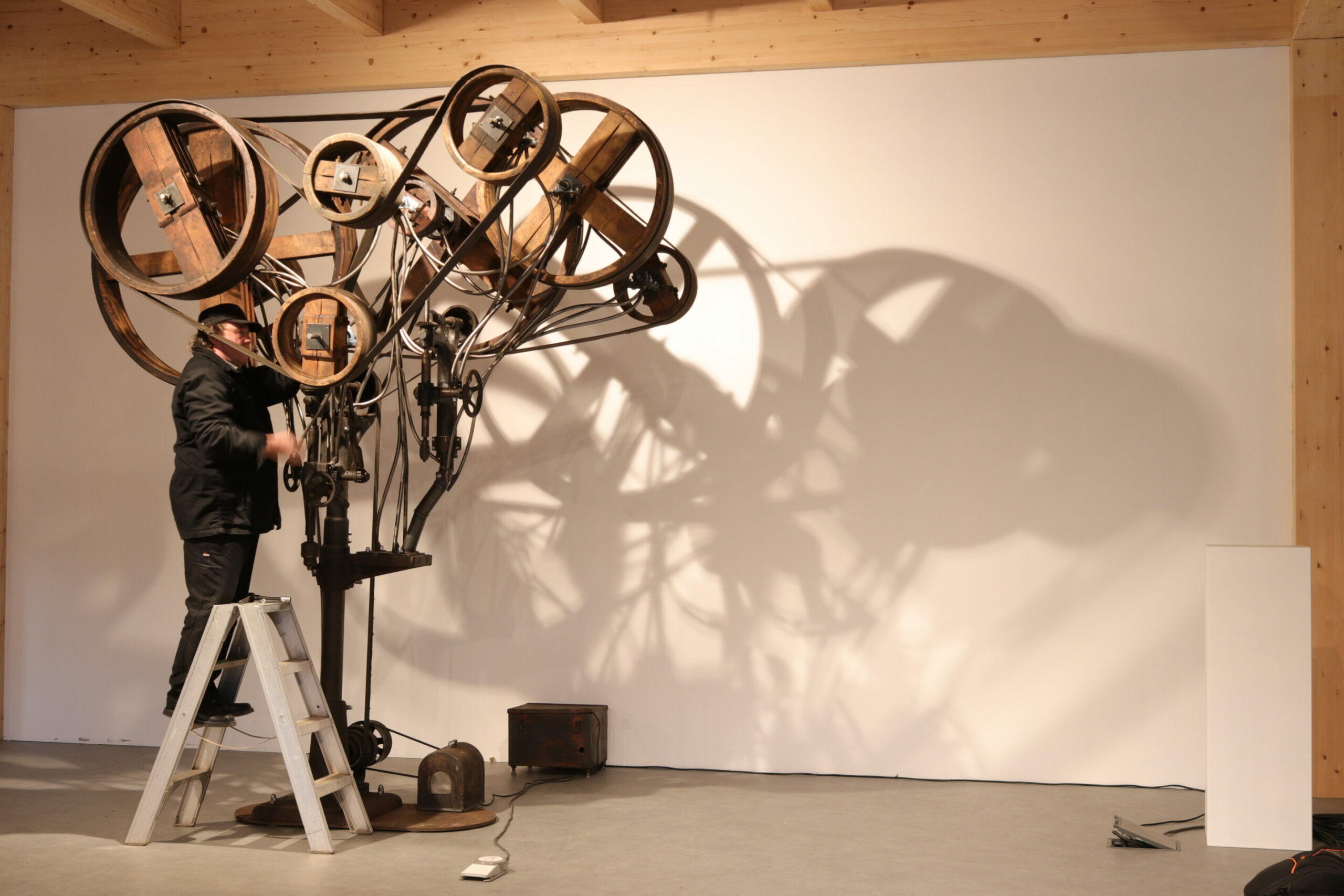 Reiche setting up one of his pieces for Sculptura #2 at Gare Maritime.