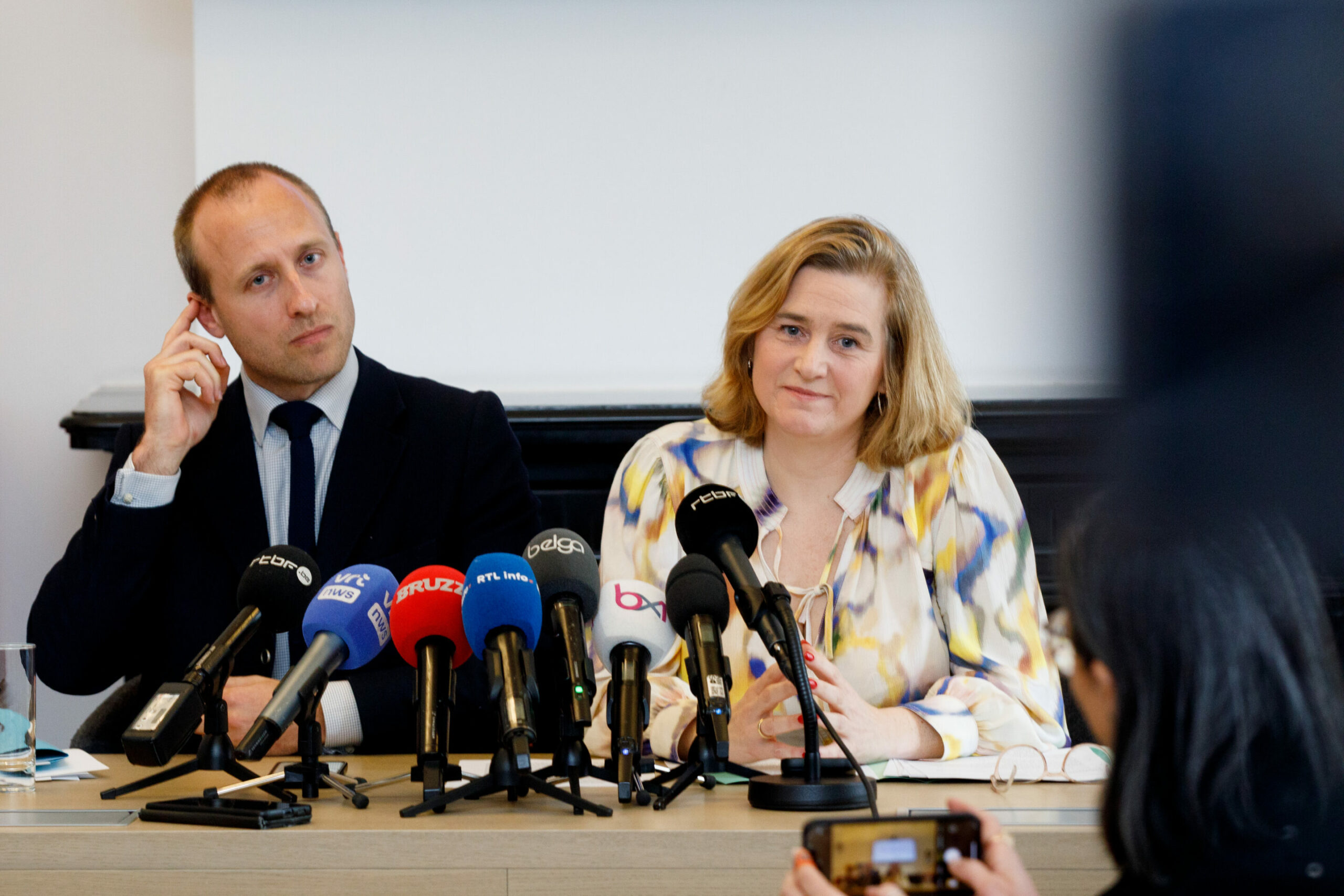 Les Engagés' Christophe De Beukelaer and Groen's Elke Van Den Brandt pictured during a press conference. Credit: Belga/Hatim Kaghat
