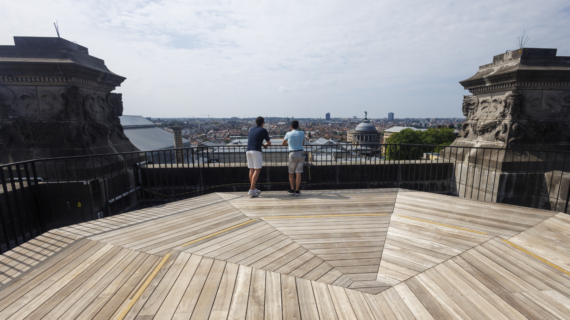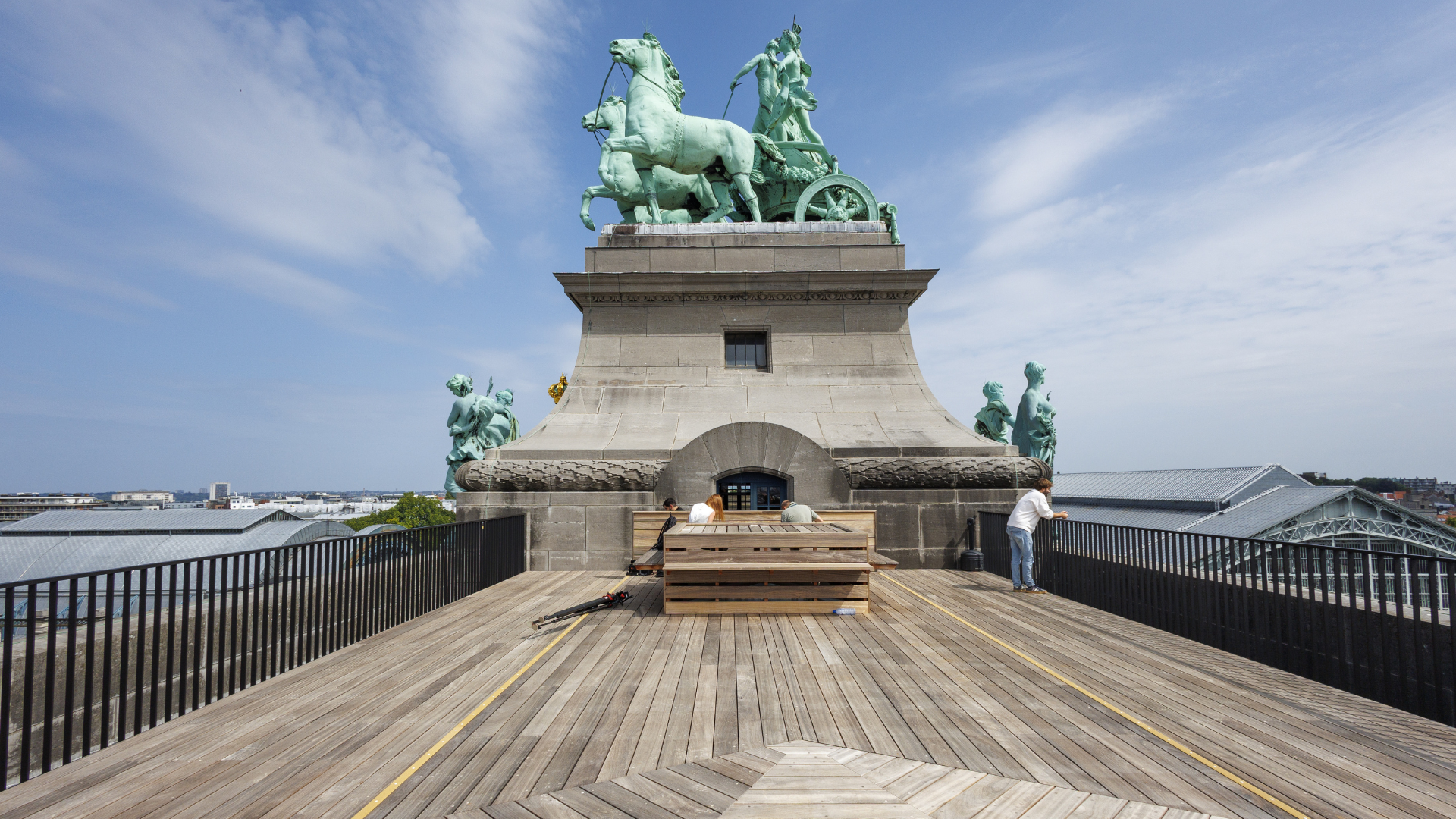 The wooden terraces are located on either side of the arch's bronze quadriga in the Cinquantenaire park (or Jubelpark in Dutch). Located in the European Quarter, the park was built in 1880 to mark the 50th anniversary of Belgium's independence.