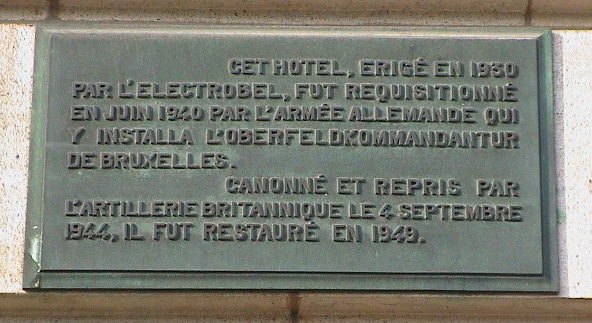Plaque reads: This hotel, built in 1930 by Electrobel, was requisitioned in June 1940 by the German army, which installed the Brussels Oberfeldkommandantur there. Bombed and recaptured by the British artillery on September 4, 1944, it was restored in 1949.