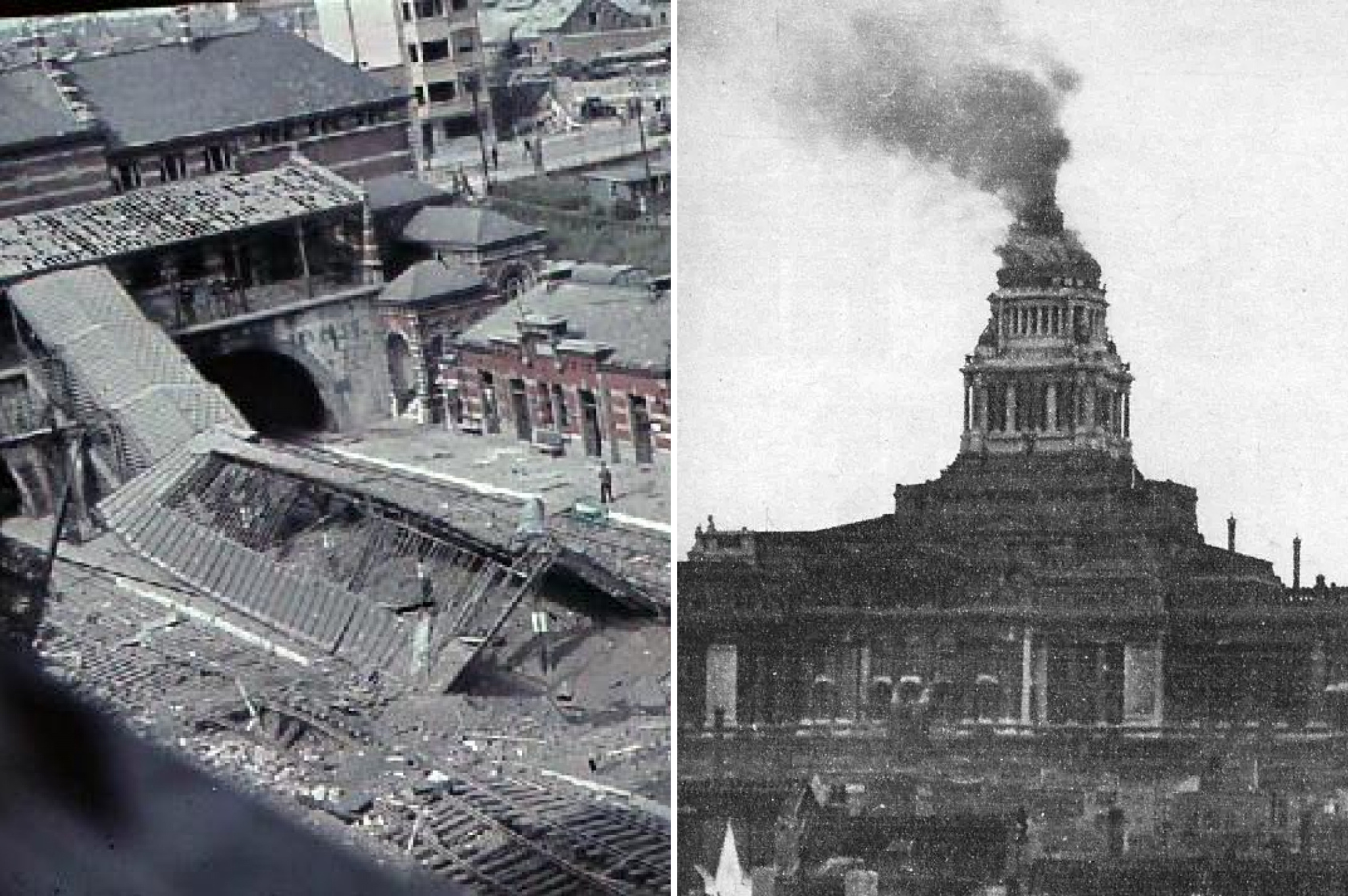 Left: Etterbeek station after being bombed by Allied forces. Right: Palais de Justice set on fire by escaping Nazis, 1944.