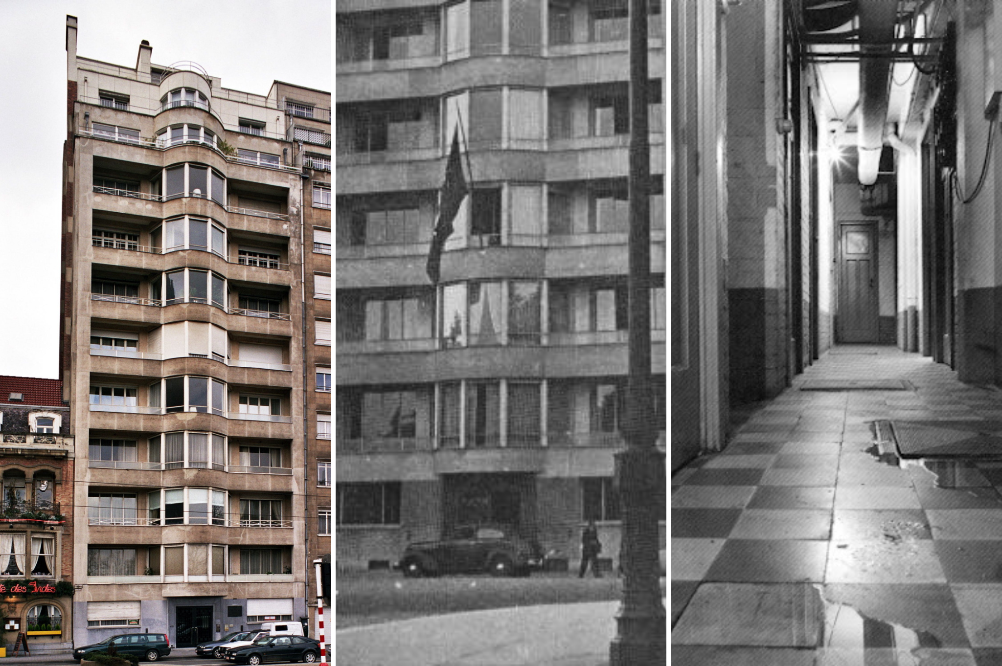 The main Gestapo headquarters during WW2 at 453, Avenue Louise. In (c), the building during the war and (r) are the prison cells.