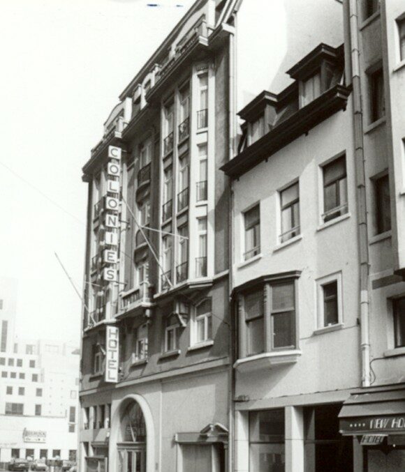9 Place Trone in Brussels. Requisitioned in 1940 by the Nazi Oberfeldkommandantur, it was used as a gun emplacement and then taken over by the British artillery in 1944. It was restored in 1949, as indicated by a plaque on the façade.