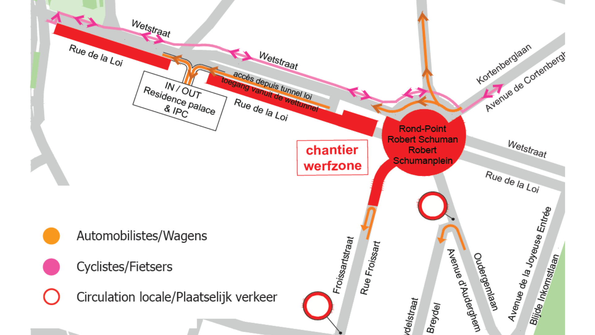 Bicycle and car traffic will be prohibited on Rue de la Loi alongside the buildings of the Council of the European Union. The access to buildings from Rue Froissart and Chaussée d'Etterbeek is not impacted. Additionally, temporary access to the Residence Palace from the exit of the Loi tunnel is maintained until the end of the project.