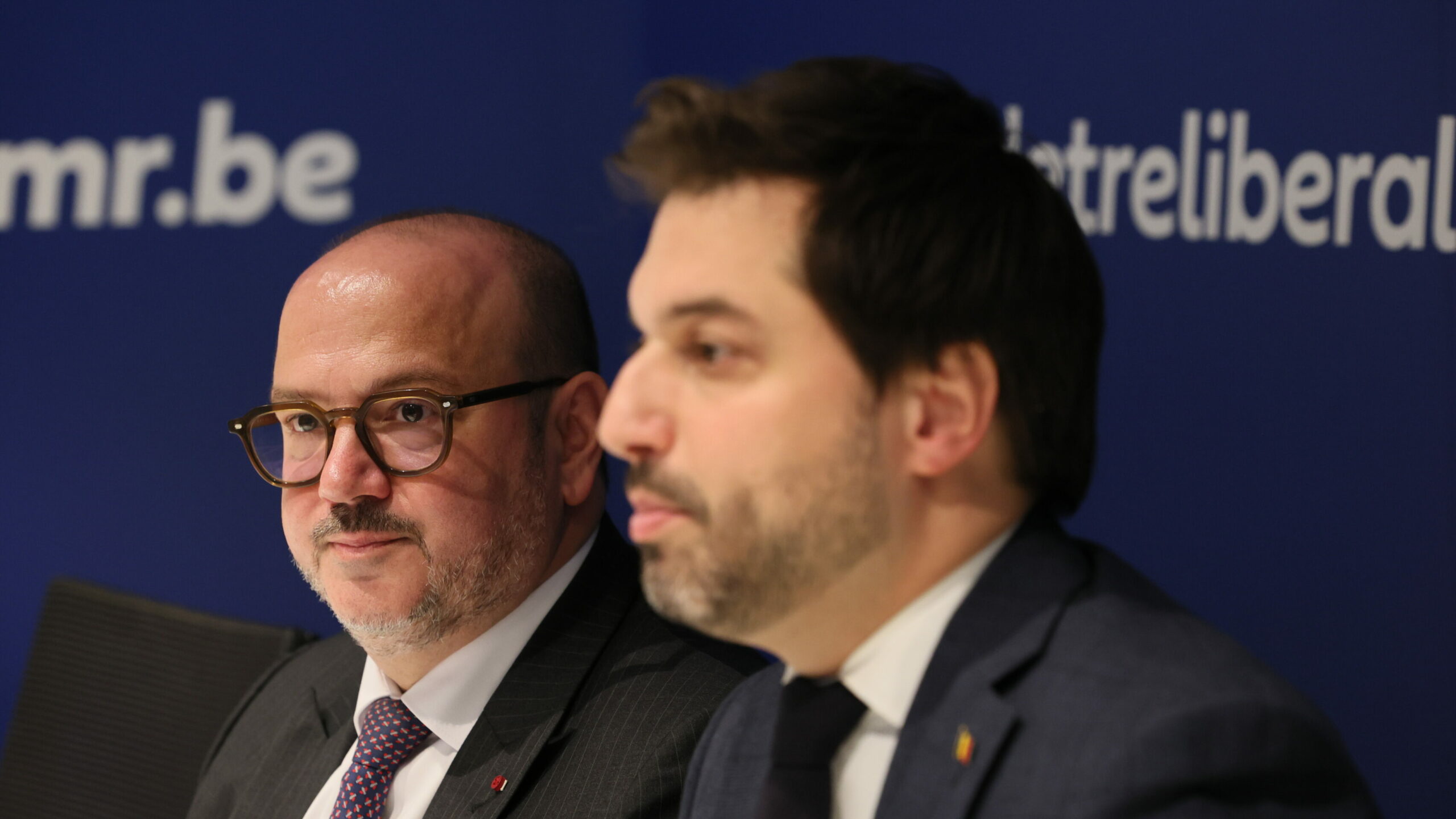 MR's Interior Minister Bernard Quintin and MR leader Georges-Louis Bouchez on 2 December 2024 in Brussels. Credit: Belga / Benoit Doppagne