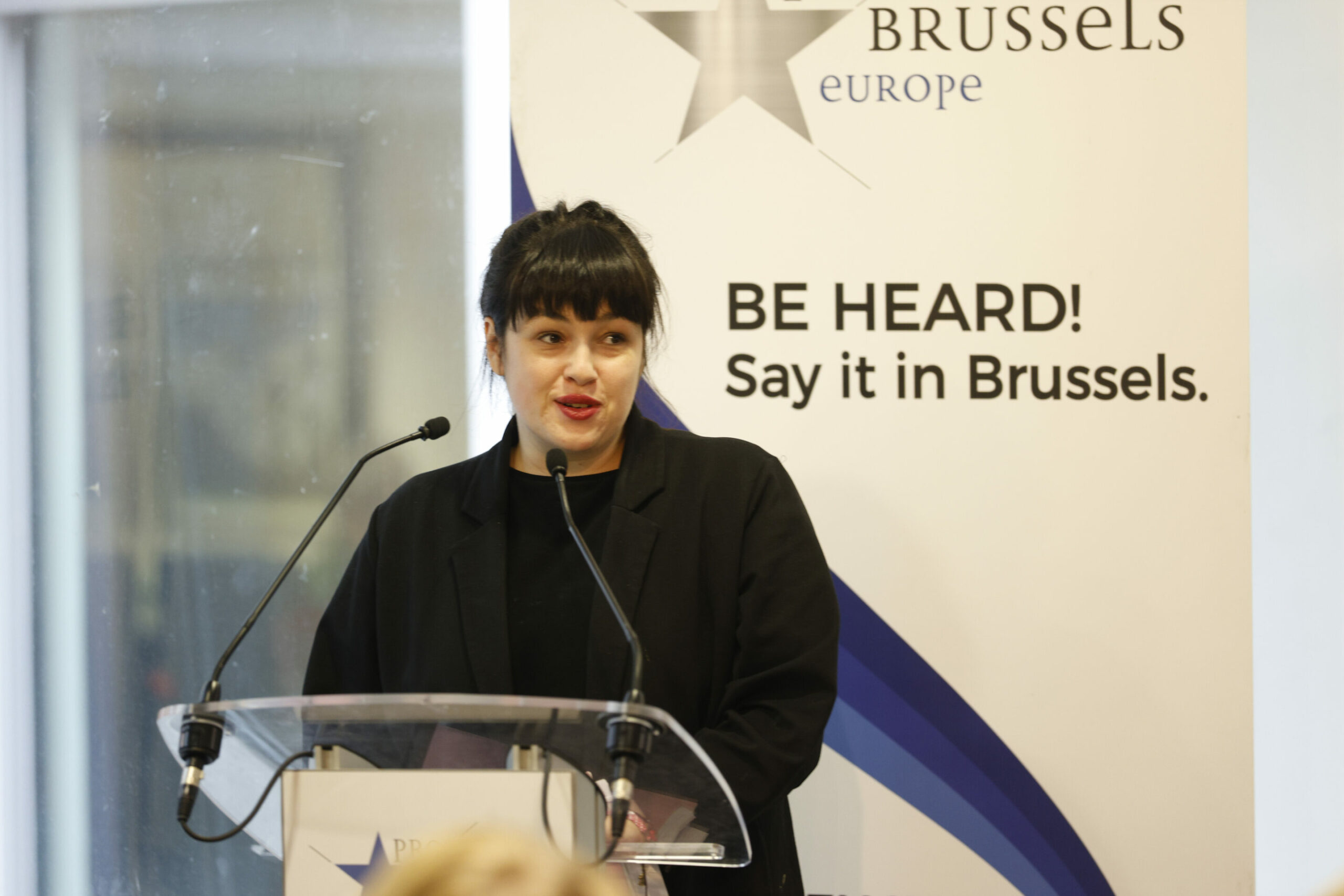 My Voice, My Choice's campaign leader Nika Kovač holding a speech. Credit: Črt Piksi