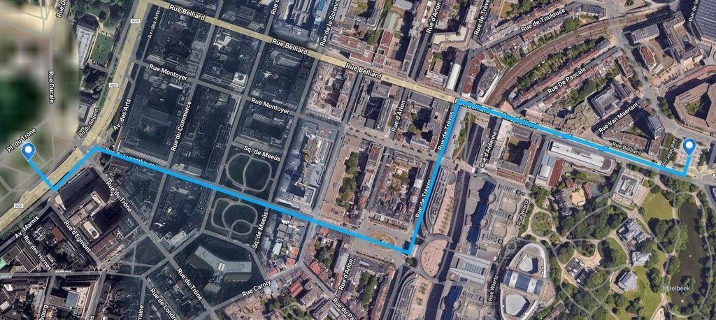 The demonstration will go through Place du Trône, Rue du Luxembourg, Place du Luxembourg, Rue de Trêves, Rue Belliard, and Place Jean Rey.