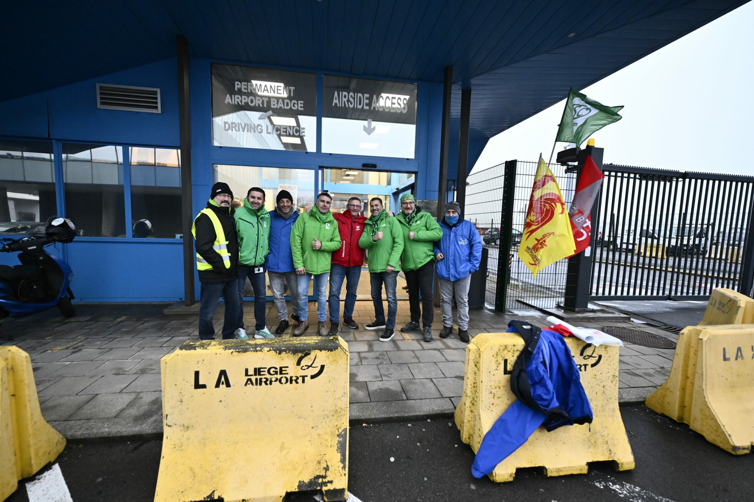 Strikers put up a picket line outside passengers terminal of Liege Airport in Bierset, Grace-Hollogne, on 26 November 2025. Credit: Belga/Eric Lalmand