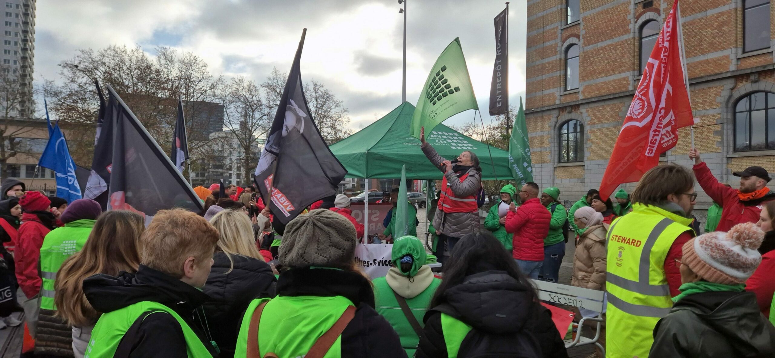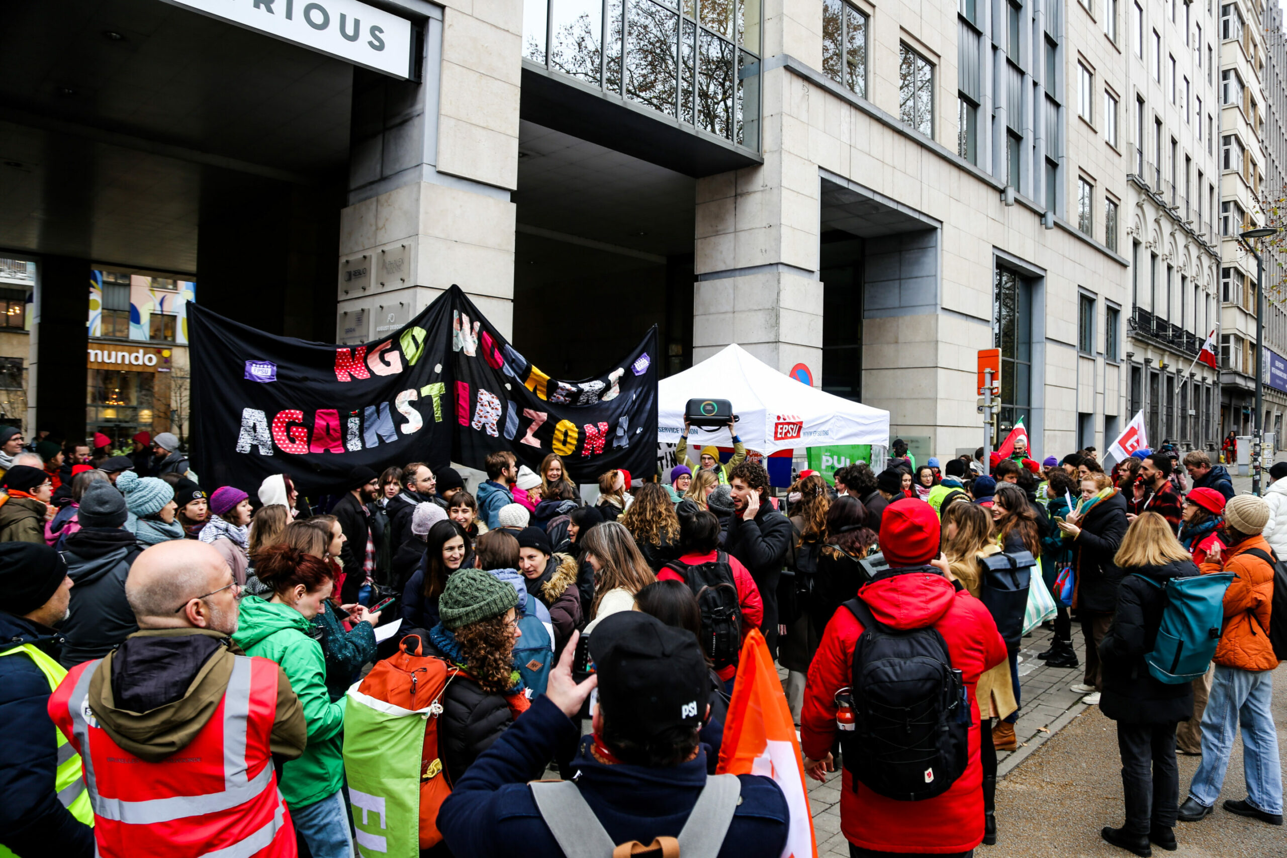 A picket line was formed in Brussels by NGO workers on 26 November 2025. Credit: EPSU