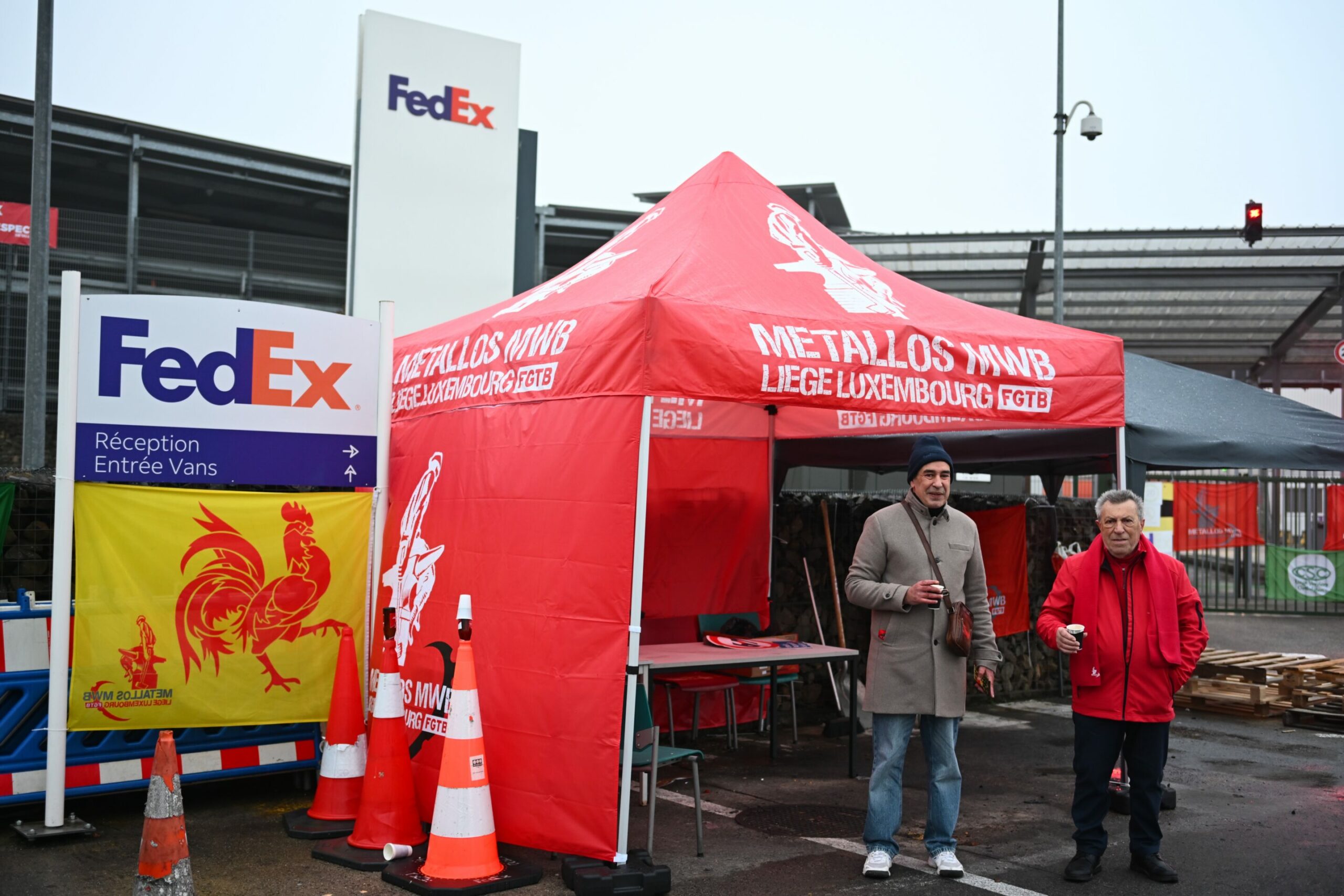Strikers put up a picket line outside the FedEx branch at Liege Airport in Bierset, Grace-Hollogne, on 26 November 2025. Credit: Belga/Eric Lalmand