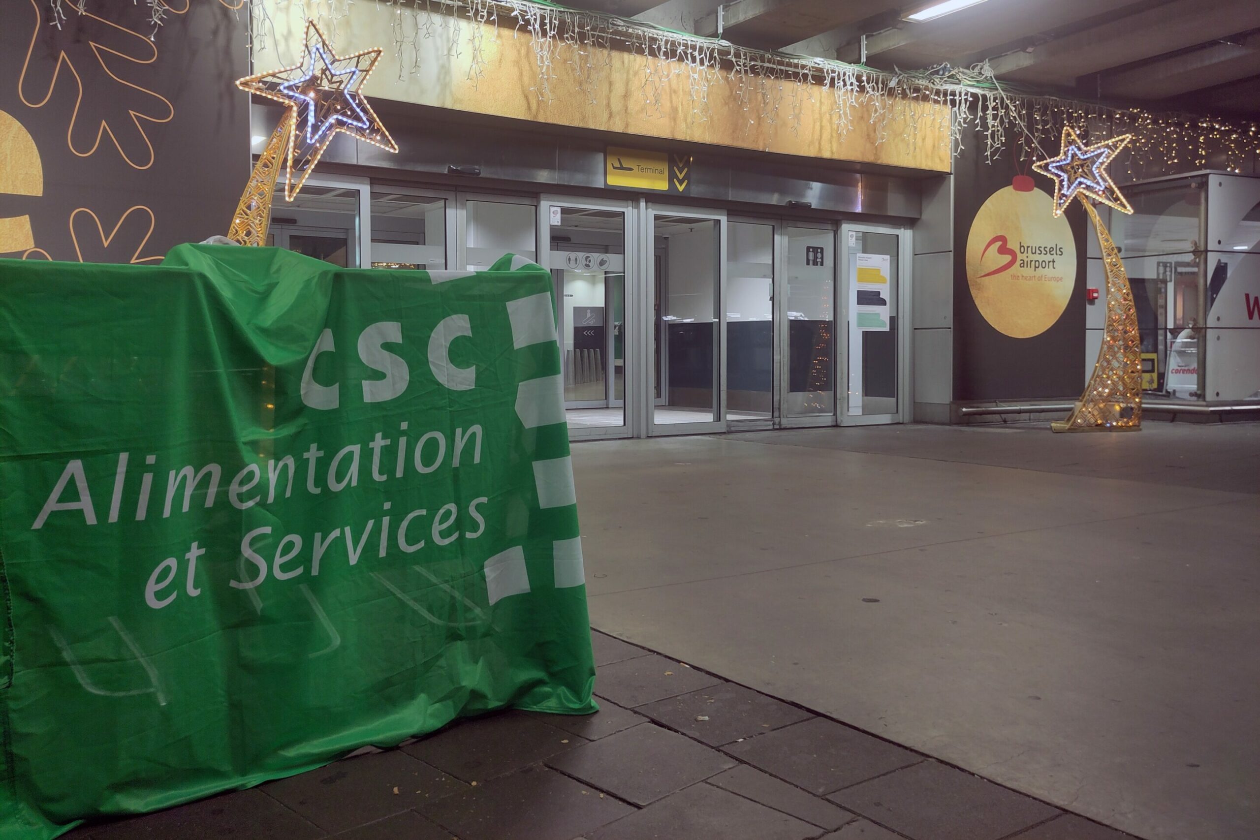 Several union members have now gathered at Brussels Airport with banners to denounce the Federal Government's austerity measures.