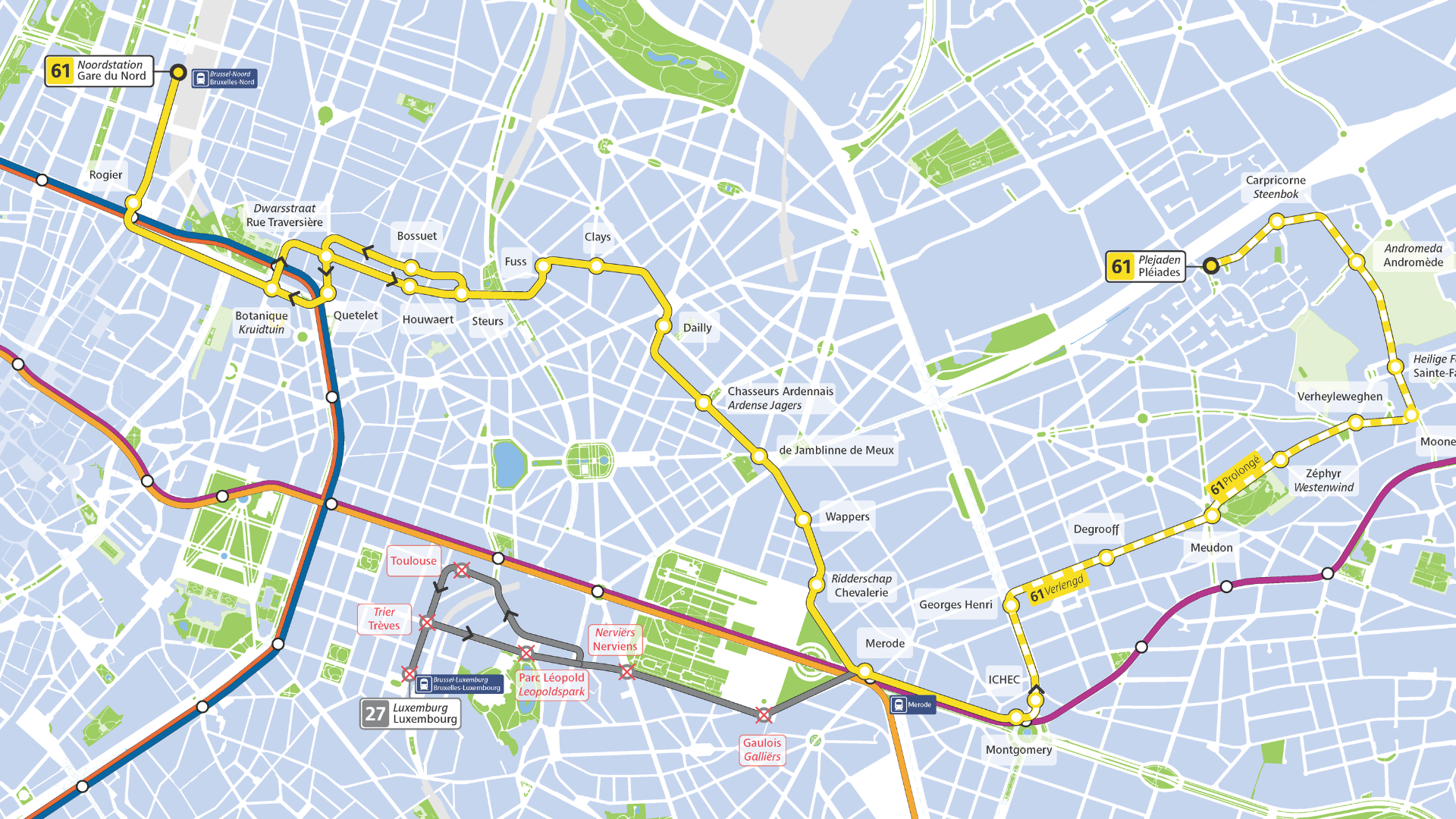 The extended line 61 will offer a new direct link between Gare du Nord, Botanique (metro lines 2 and 6), Place Dailly, Rue Georges Henri and the Pléiades district in Woluwe-Saint-Lambert.
