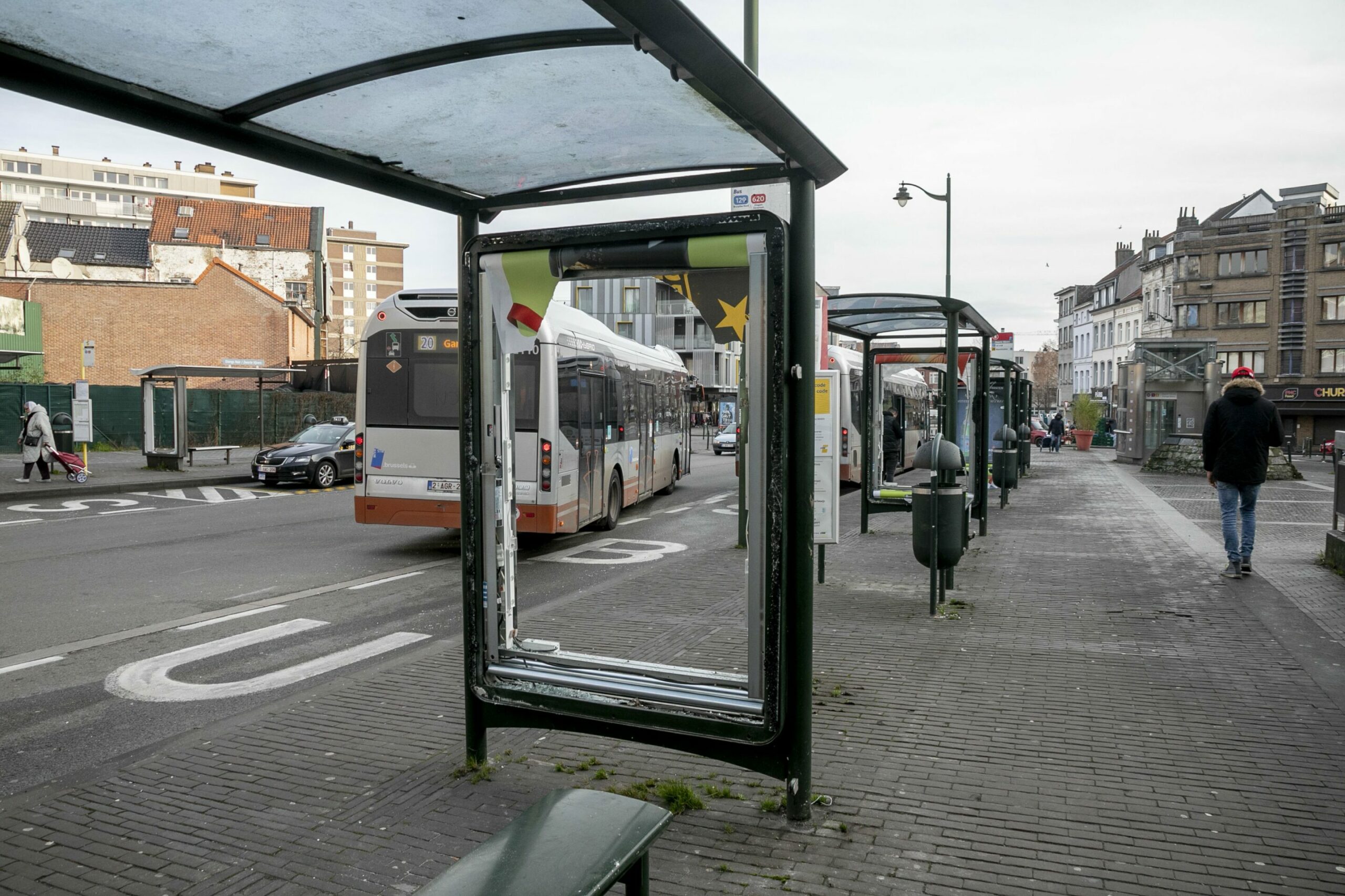 Illustration picture shows a destroyed bus shelter in Etangs Noirs on New Year's Day 2022 in Brussels. Credit: Hatim Kaghat/Belga