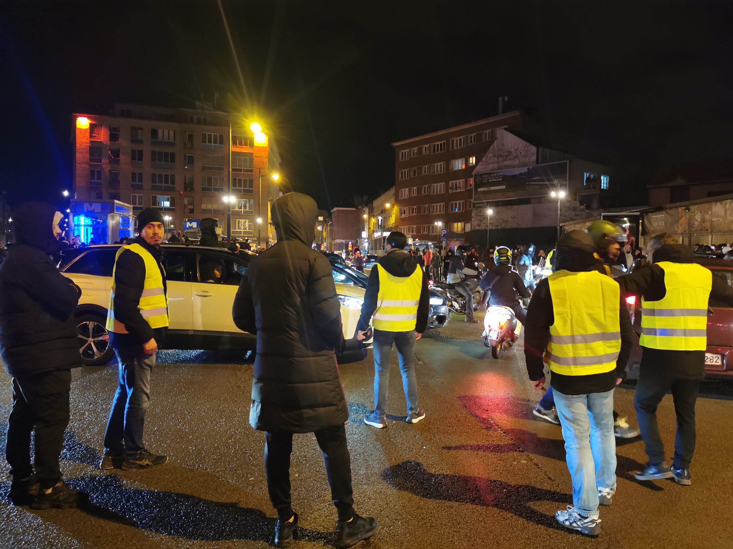Around 30 people wearing yellow vests, many of them local residents and members of community associations, positioned themselves around the square after the game. Among them was Abdel Bohlahl, head of the ASBL Mini Molenbeek, an association based on the Étangs Noirs square and focused primarily on sport, particularly indoor football.