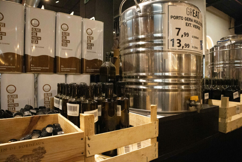 The stand for pouring olive oil into glass bottles. Credit: Kosmos Khoroshavin / The Brussels Times