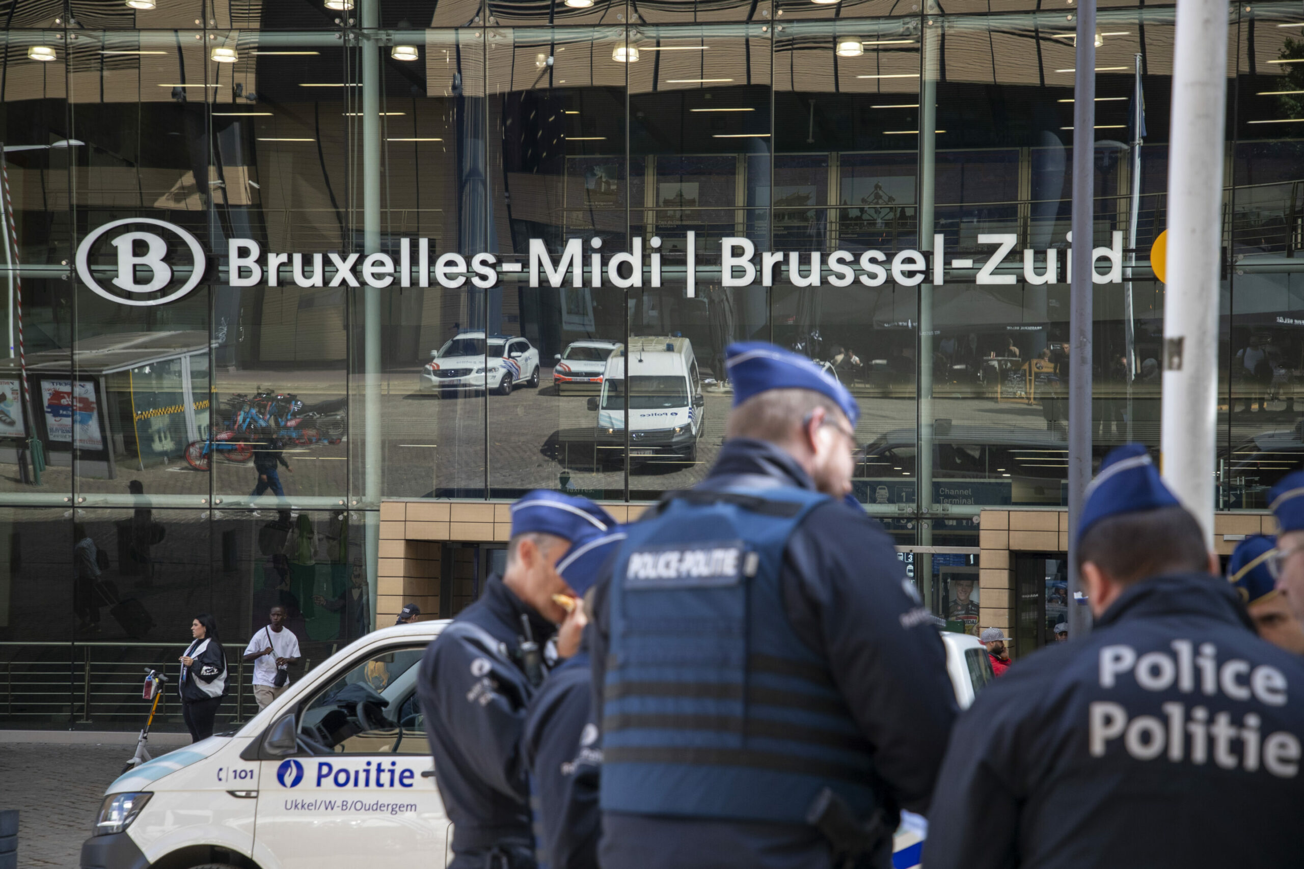 Police officers in front of Brussels-Midi station, Saturday 26 August 2023. Credit: Belga / Nicolas Maeterlinck