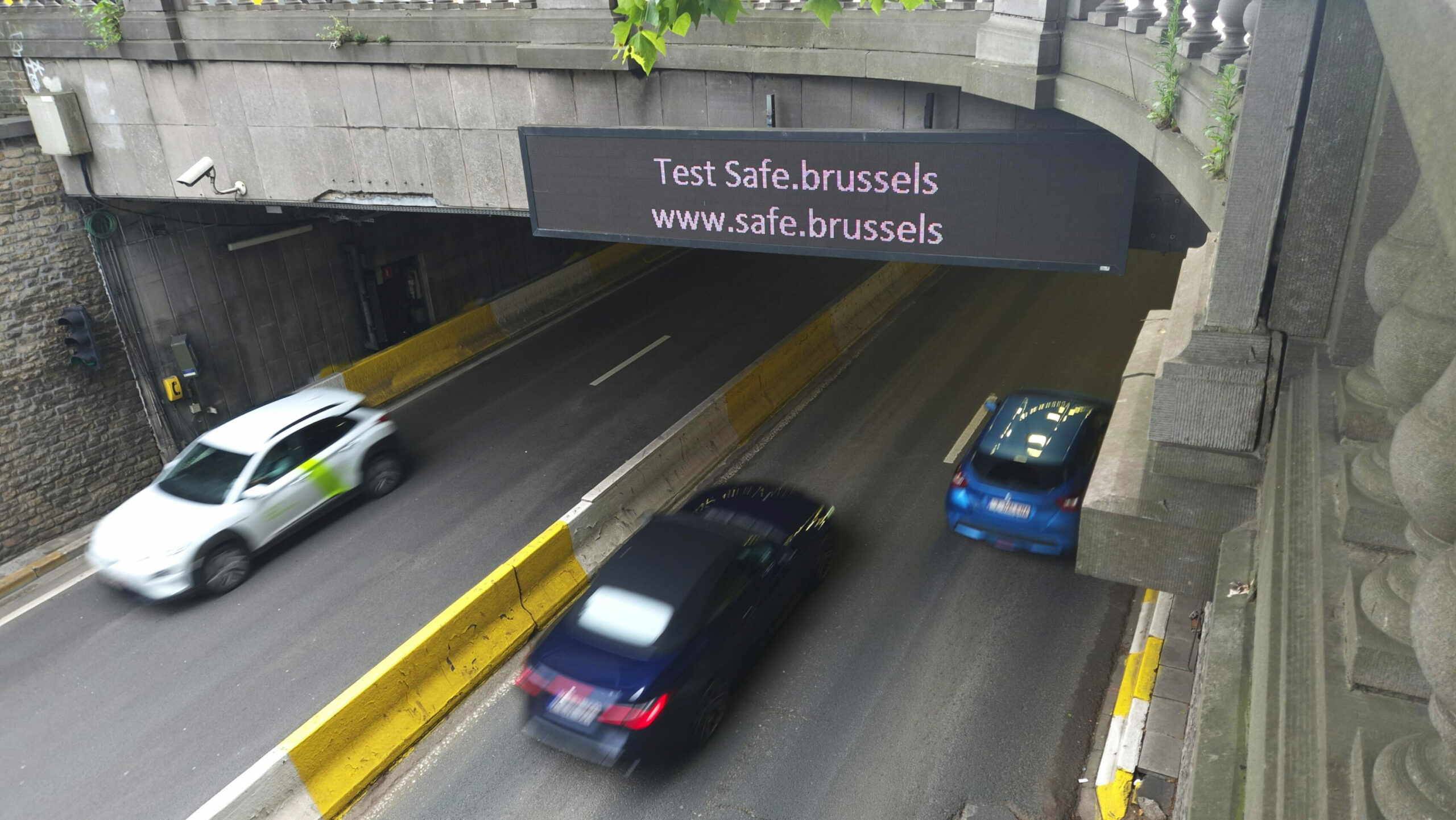 Warning message of Safe.Brussels pictured at an electronic sign above the entrance of a Brussels' tunnel, Tuesday 10 June 2025. Credit: Belga