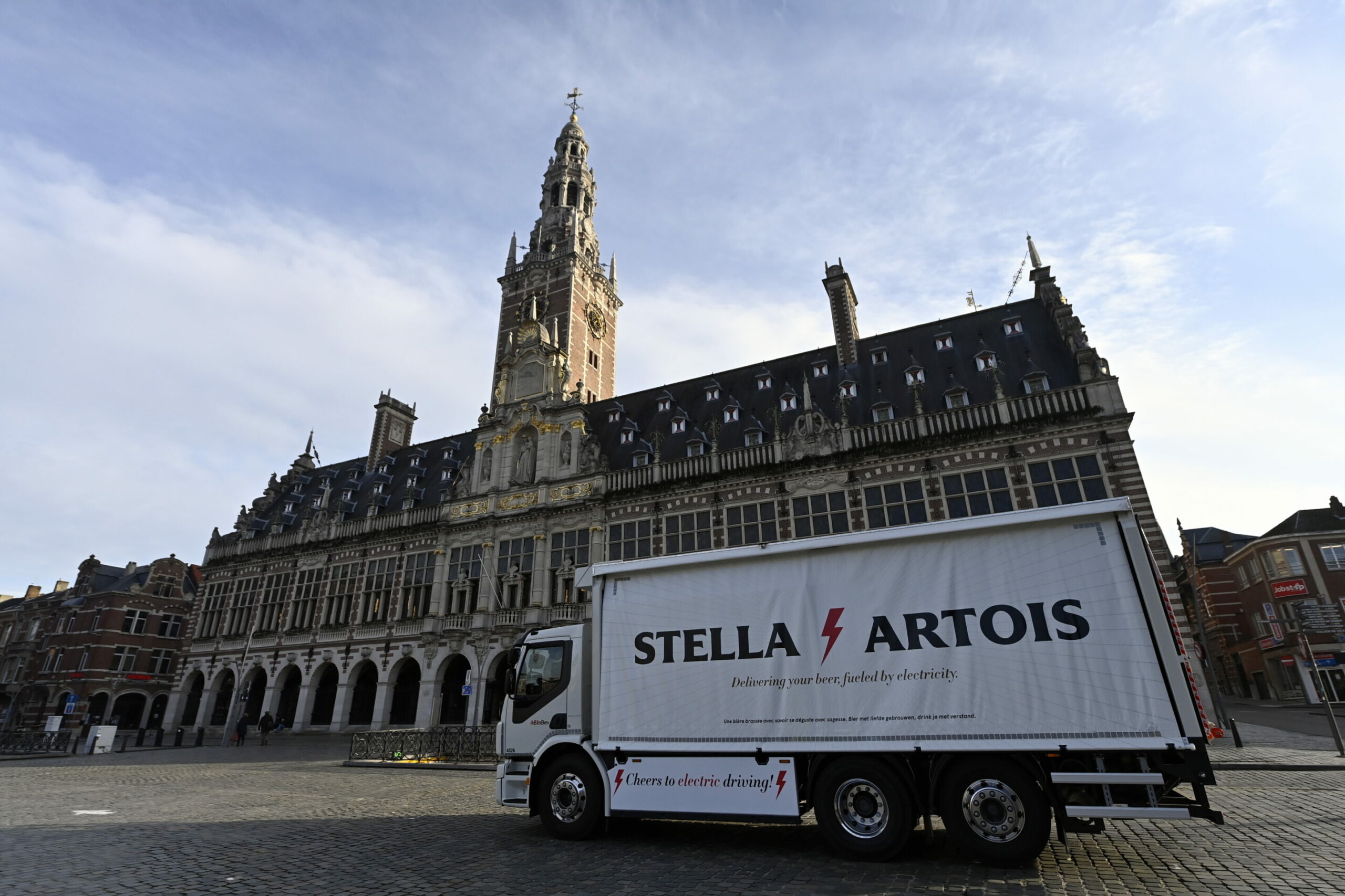 The first Belgian e-truck delivering AB Inbev beer in Leuven, Tuesday 08 December 2020. Credit: Belga