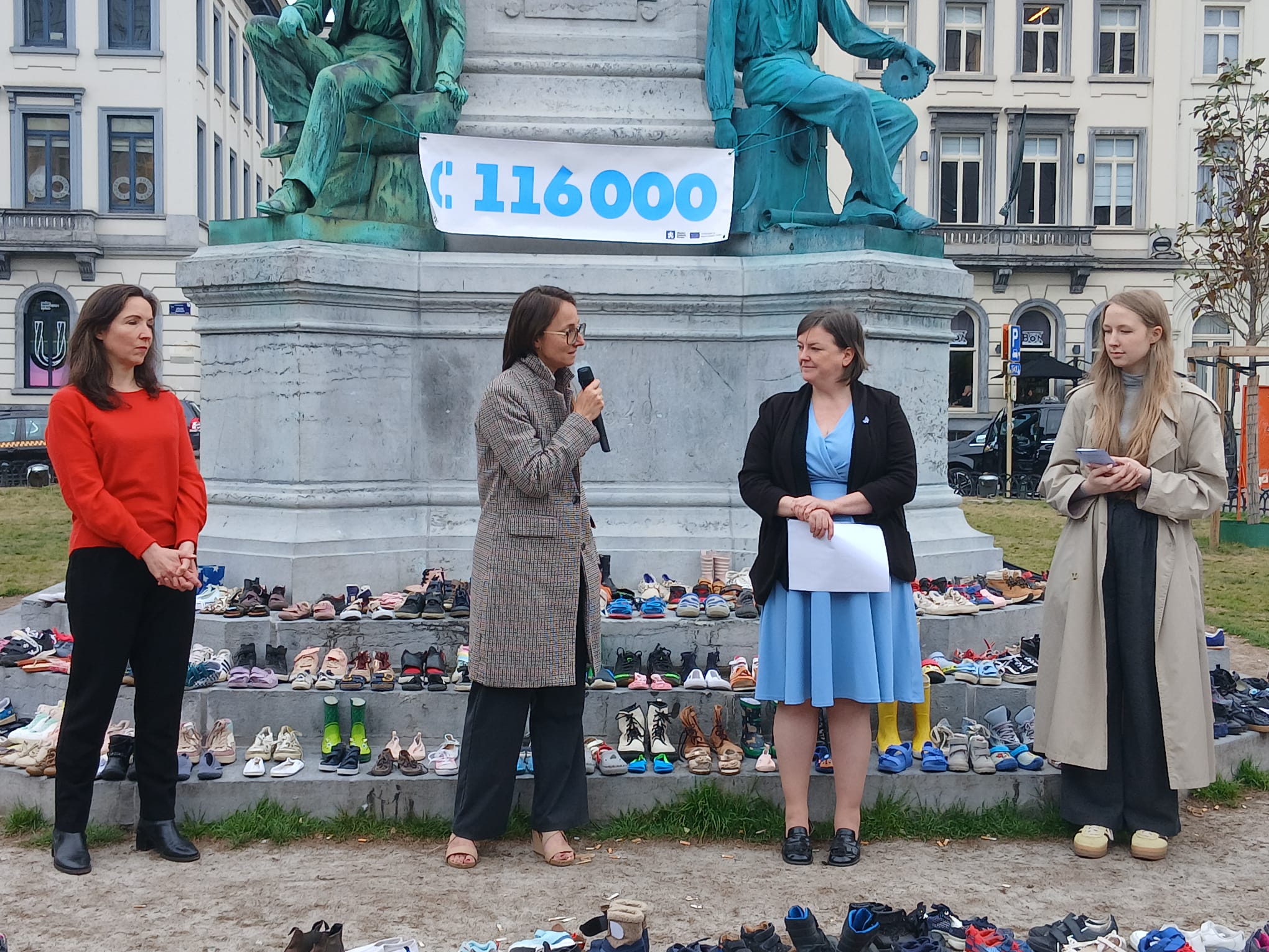Children's shoes and the 116000 missing children hotline banner on display as part of an action by Missing Children Europe. Credit: The Brussels Times/Rita Alves