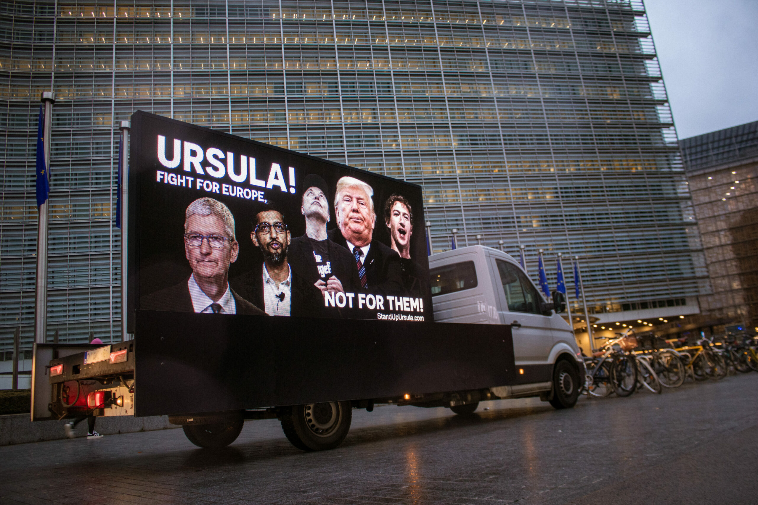 Campaigners from People vs Big Tech, WeMove Europe, and EDRi launched four mobile billboards driving across Brussels, calling on Ursula von der Leyen to stand up to Trump and Big Tech, and defend Europe’s digital laws, Wednesday 19 November 2025.