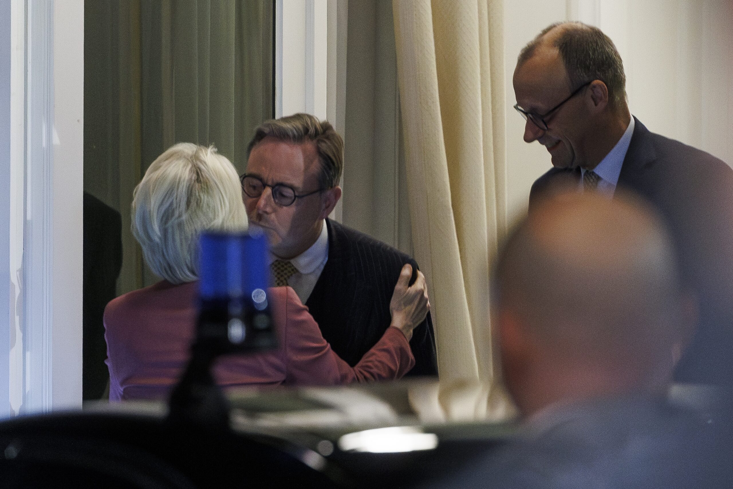 EU President Ursula von der Leyen, Prime Minister Bart De Wever and German Chancellor Friedrich Merz pictured during a meeting in Brussels, on Friday 05 December 2025. Credit: Nicolas Maeterlinck/Belga