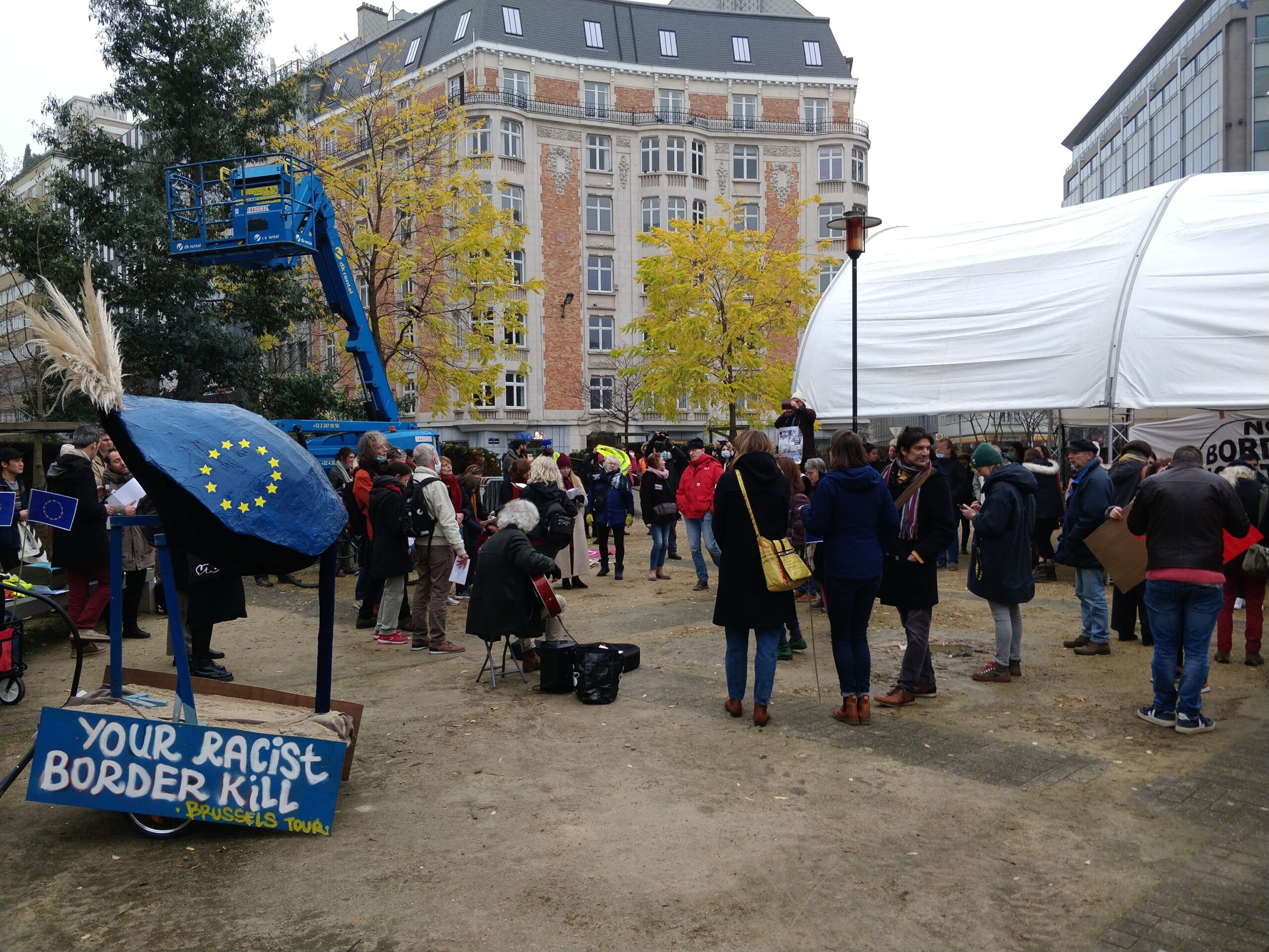 Some one hundred people protest against European migration policy in the European quarter in Brussels, Saturday 18 December 2021. Credit: Belga