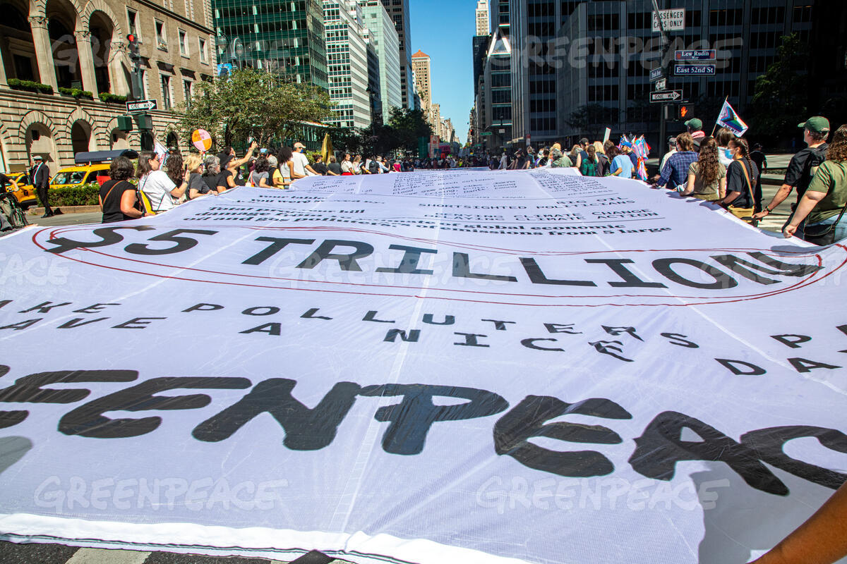Greenpeace deploys a giant “Climate Polluters Bill” through midtown Manhattan while activists marching in the Make Billionaires Pay March, © Tim Aubry/ Greenpeace