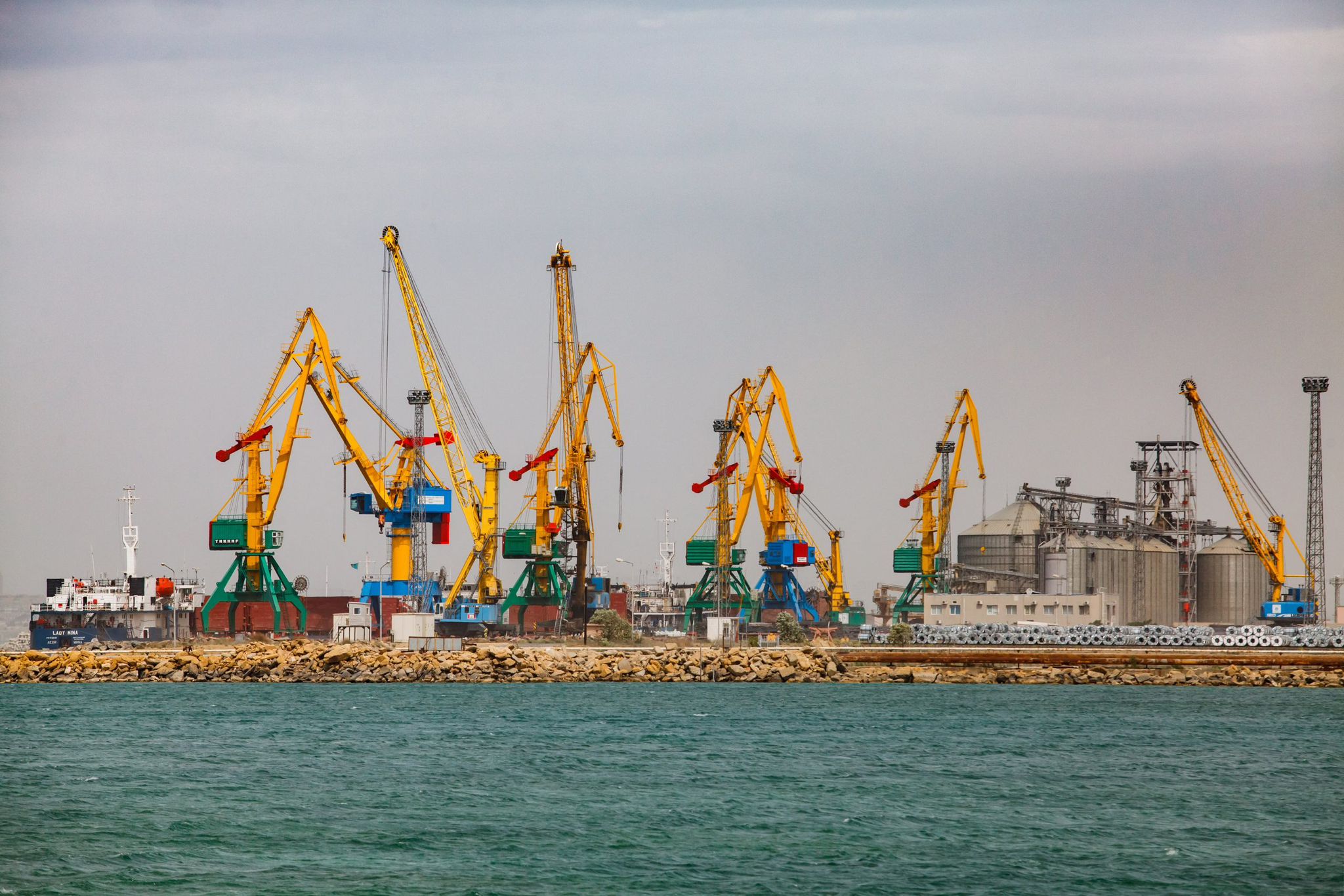 Cranes at the Port of Aktau on the Caspian Sea — a vital hub of the Trans-Caspian International Transport Route that connects Europe and Asia