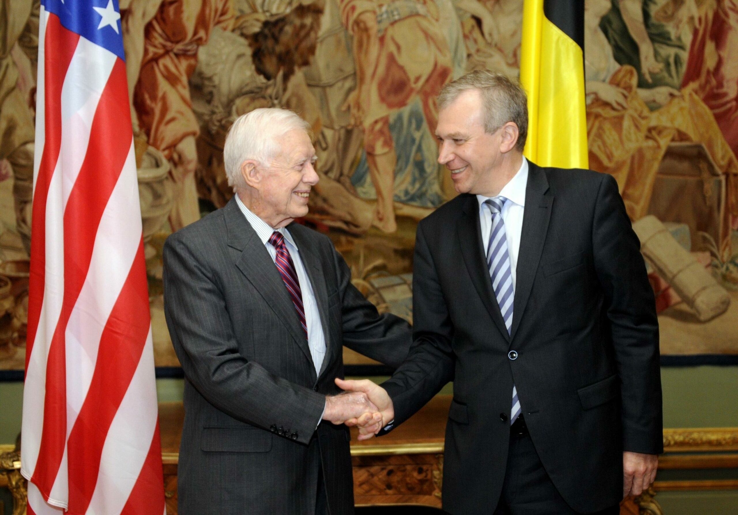 Olivier Chastel shakes hands with Jimmy Carter on Monday 3 October 2011 in Brussels. Credit: Belga / Eric Lalmand