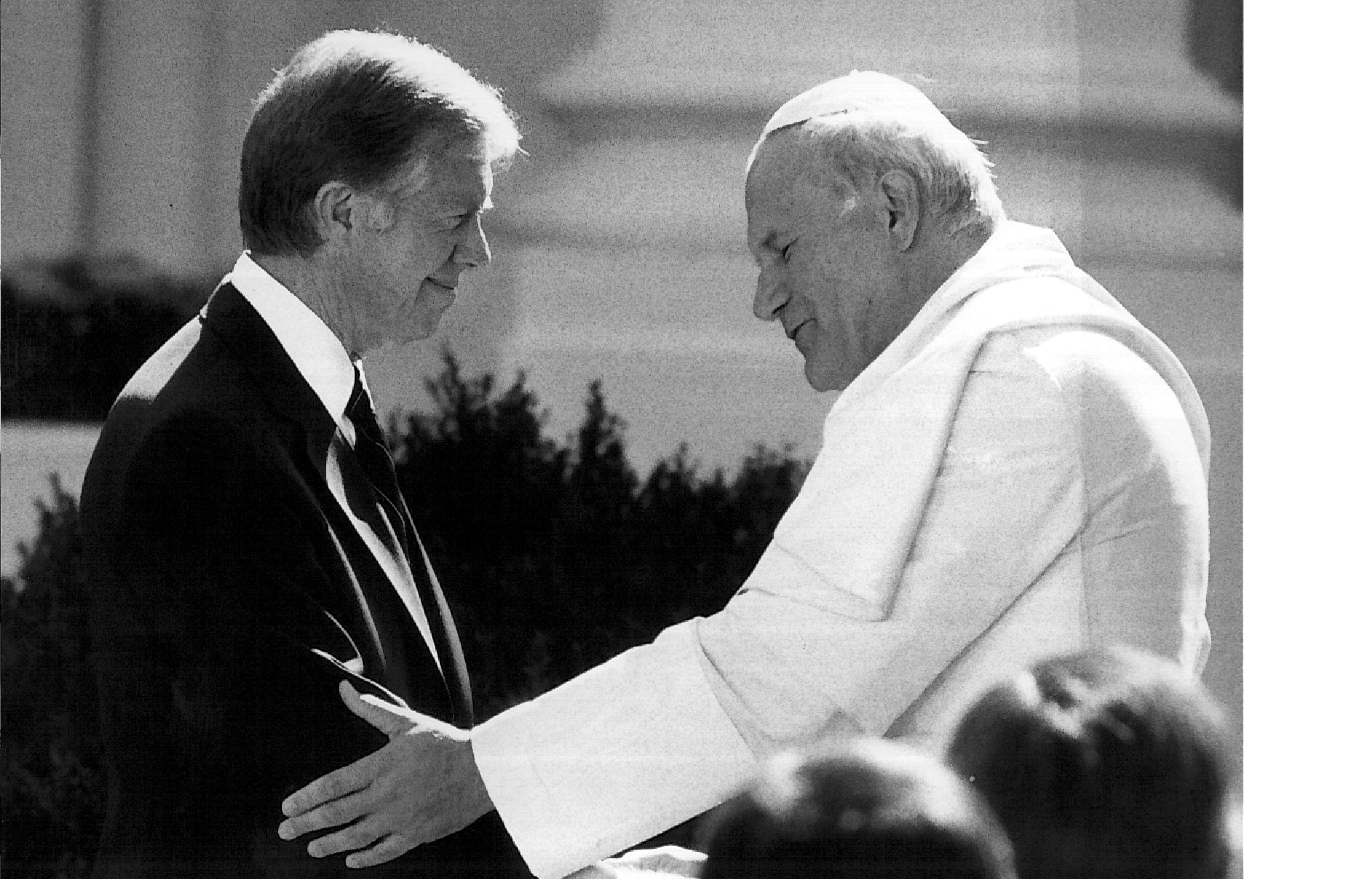 Pope John Paul II embraces US President Jimmy Carter on the north lawn of the White House in Washington on 6 October 1979. Credit: Belga