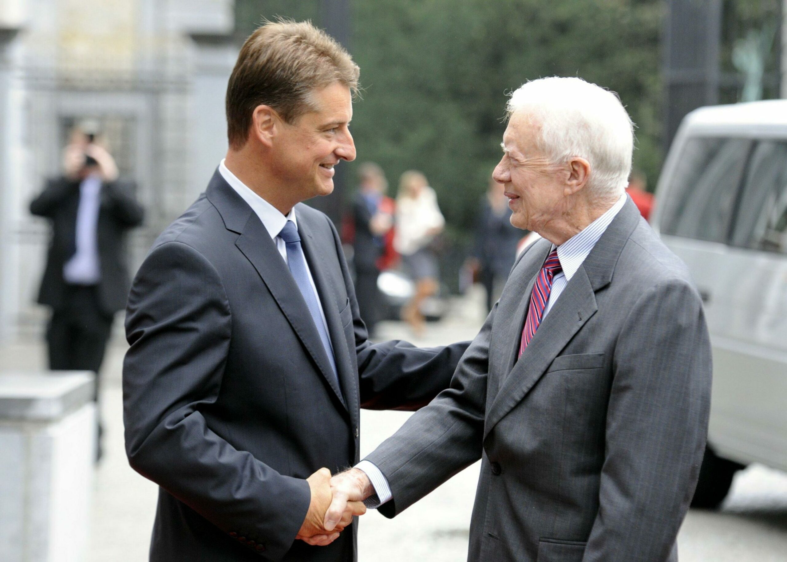 Former Belgian Prime Minister Yves Leterme and former US president Jimmy Carter shake hands during Carter's visit to Belgium, Monday 3 October 2011 in Brussels. Credit: Belga / Eric Lalmand