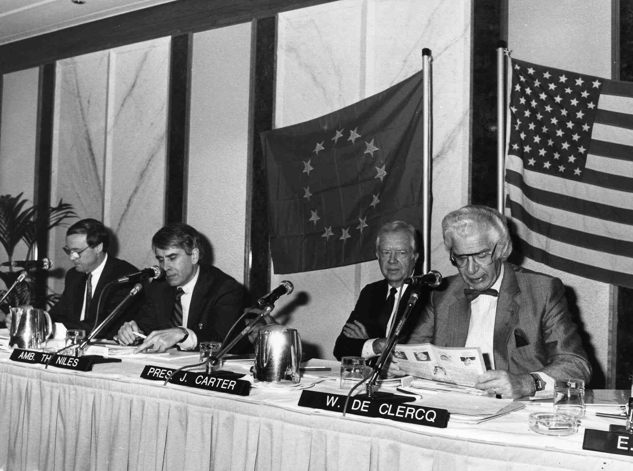Former US president Jimmy Carter (Centre) and Former European Commissioner for External Relations and Trade Willy de Clercq (Right). Credit: Belga Archives